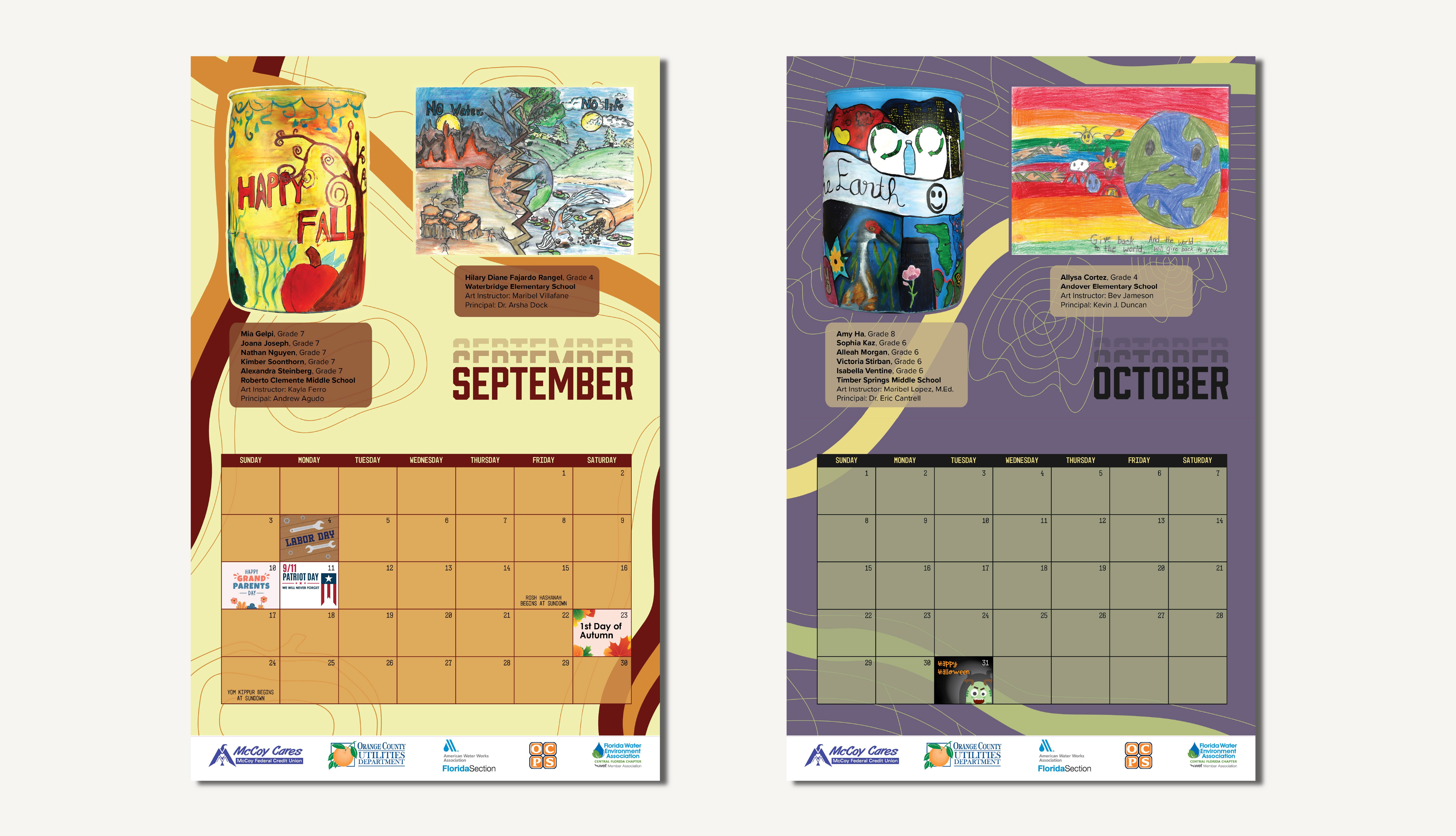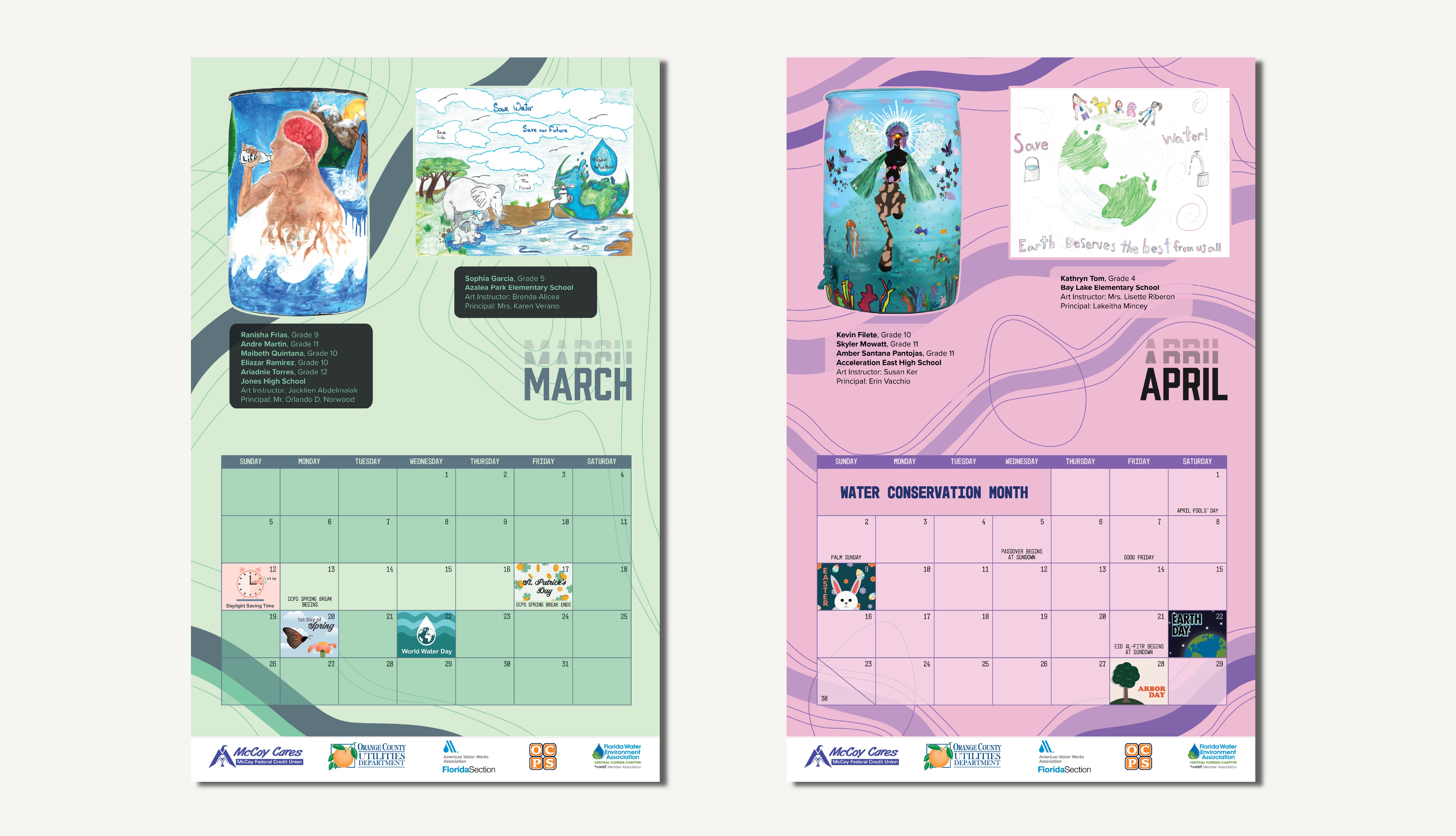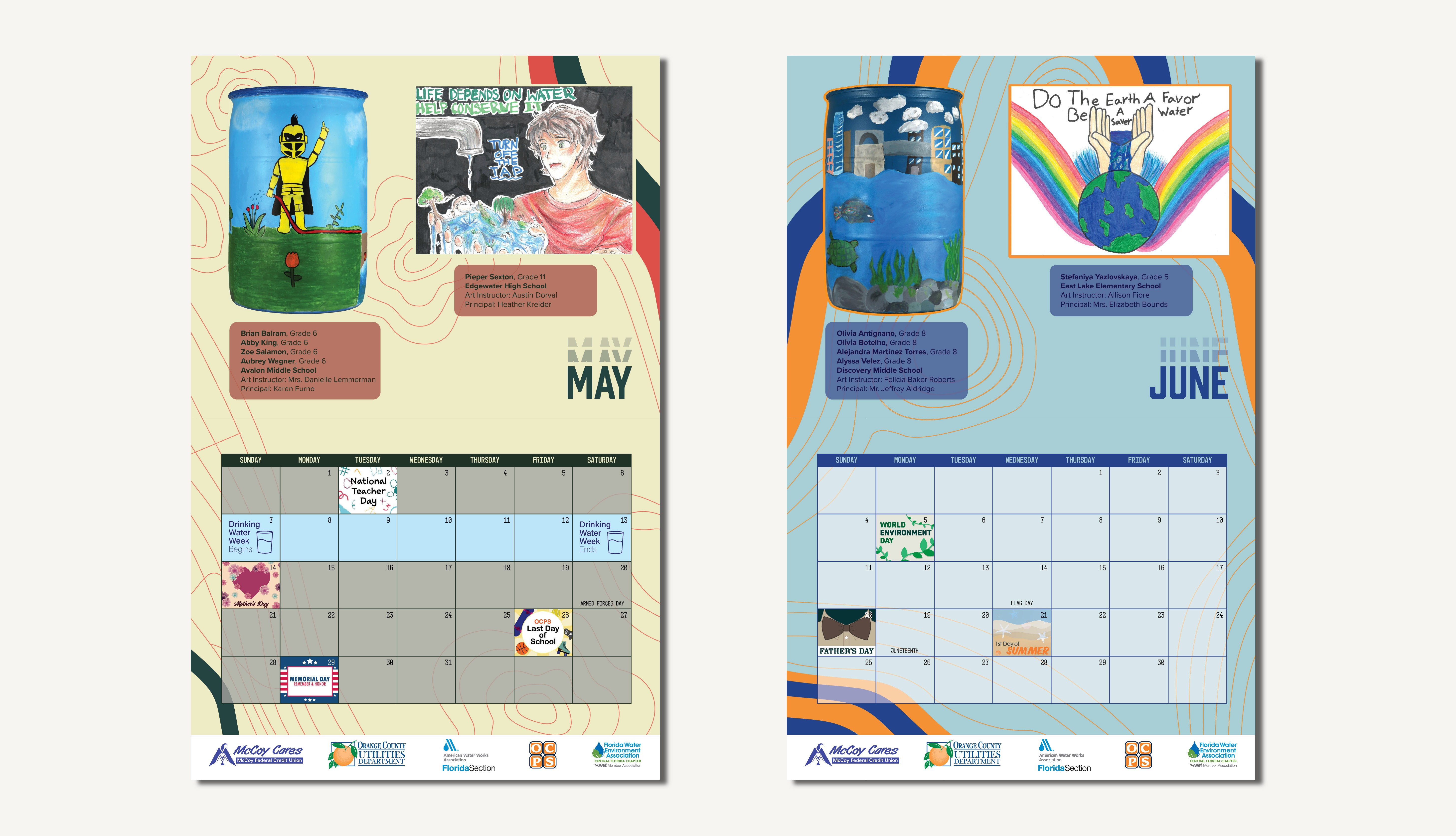 The 2023 Water Conservation Calendar was used promote and educate students on the importance of water conservation. It features student made artwork from the annual Water Conservation Contest created by Orange County Utilities Department.