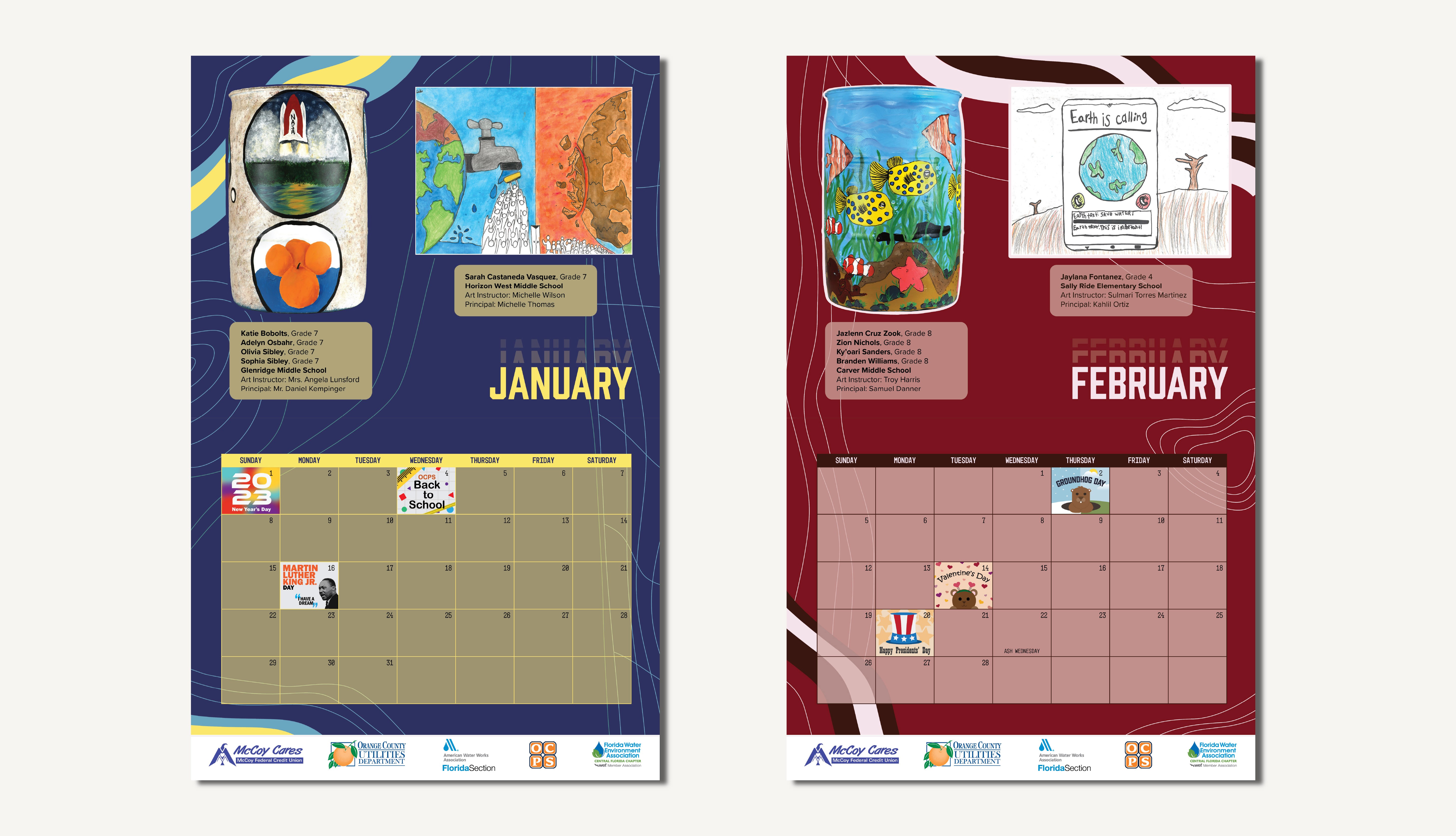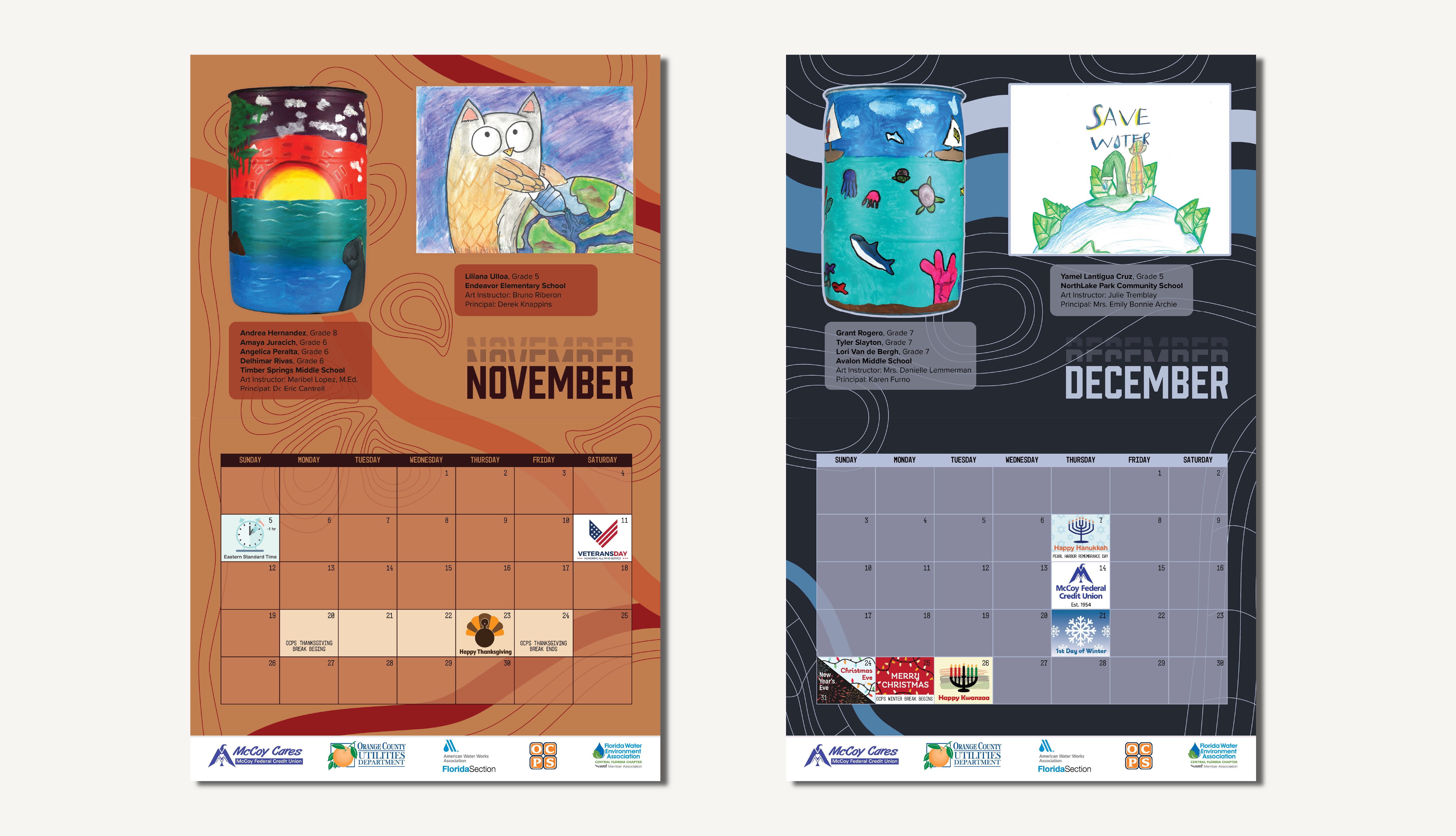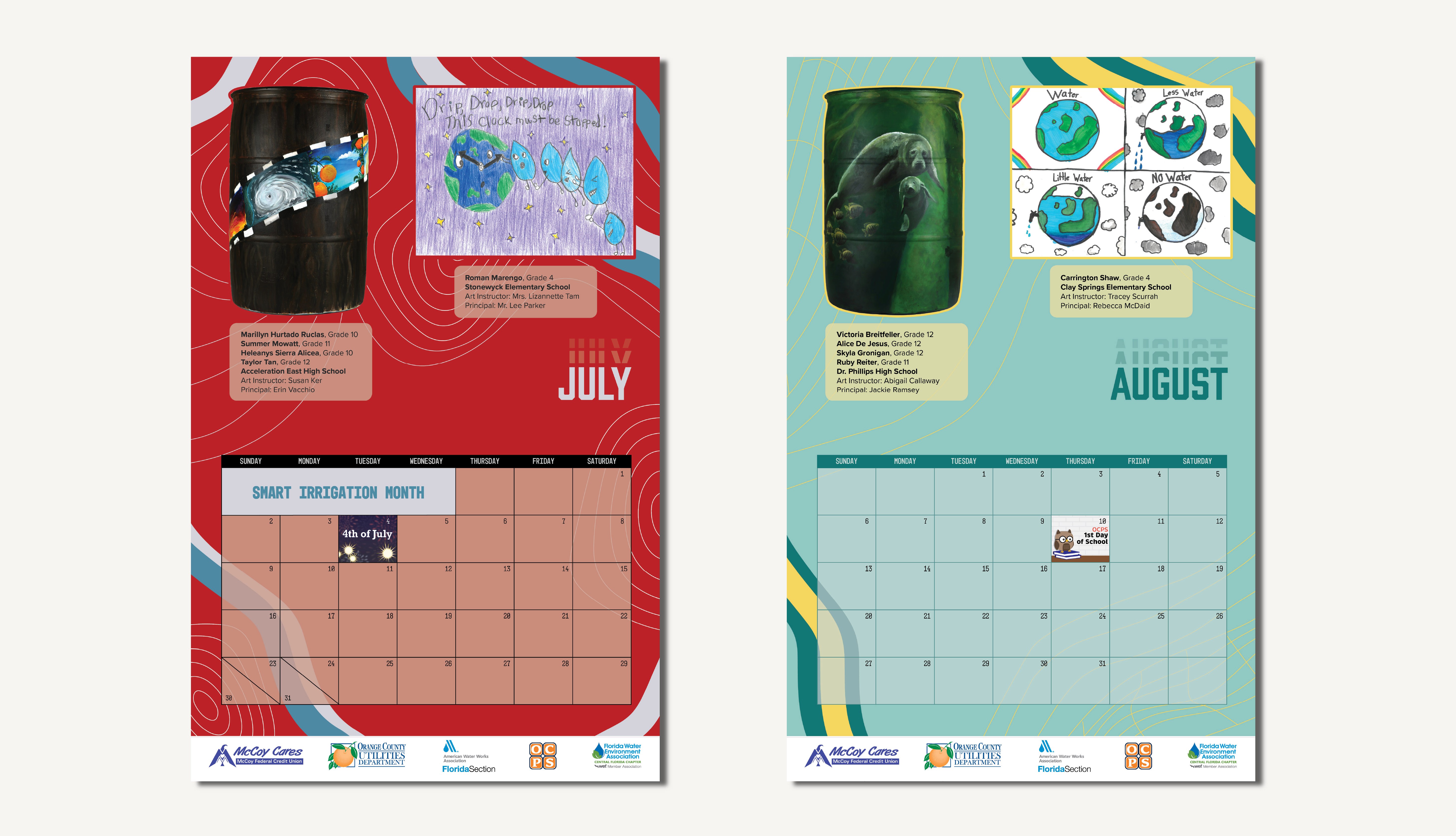 The 2023 Water Conservation Calendar was used promote and educate students on the importance of water conservation. It features student made artwork from the annual Water Conservation Contest created by Orange County Utilities Department.
