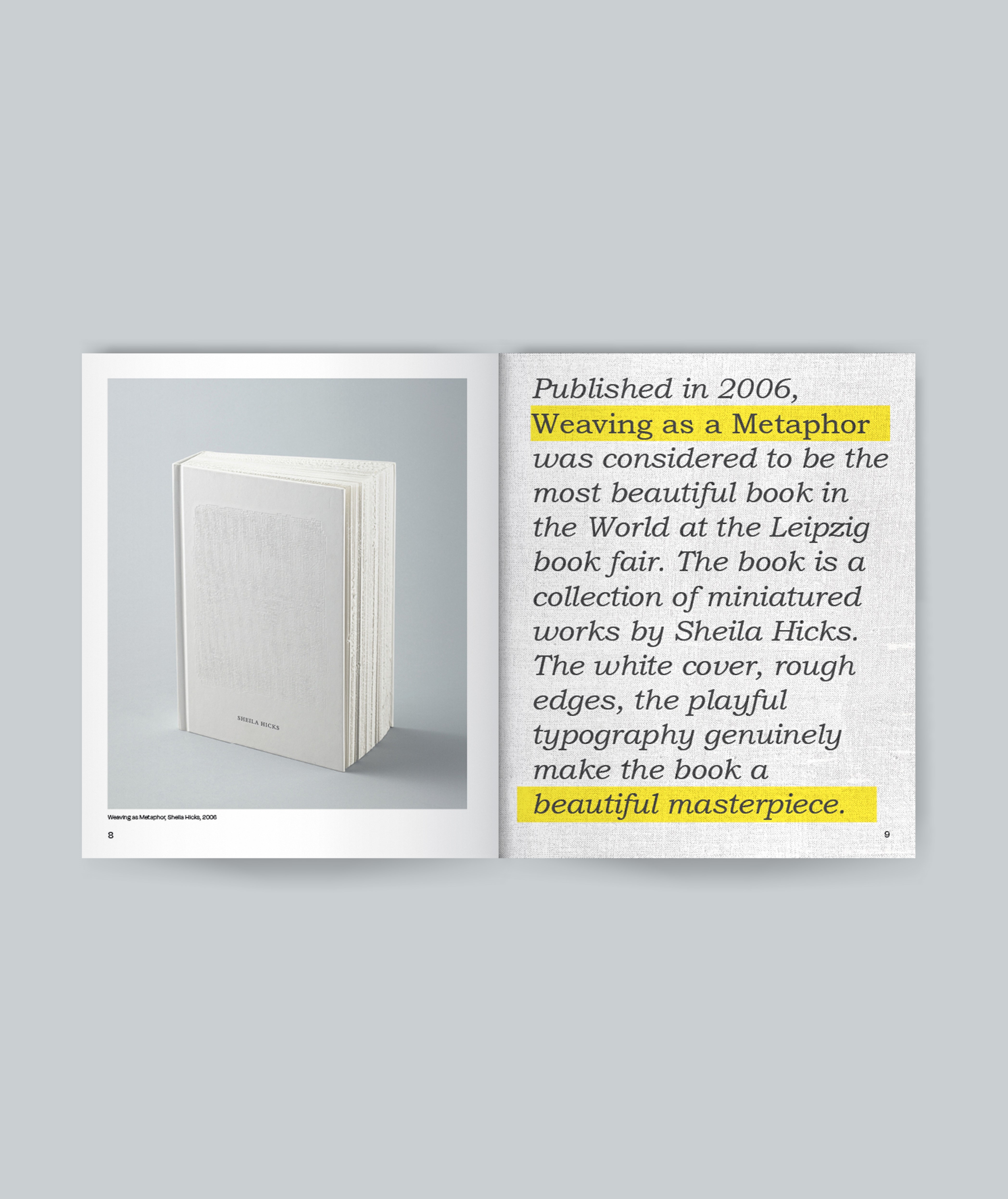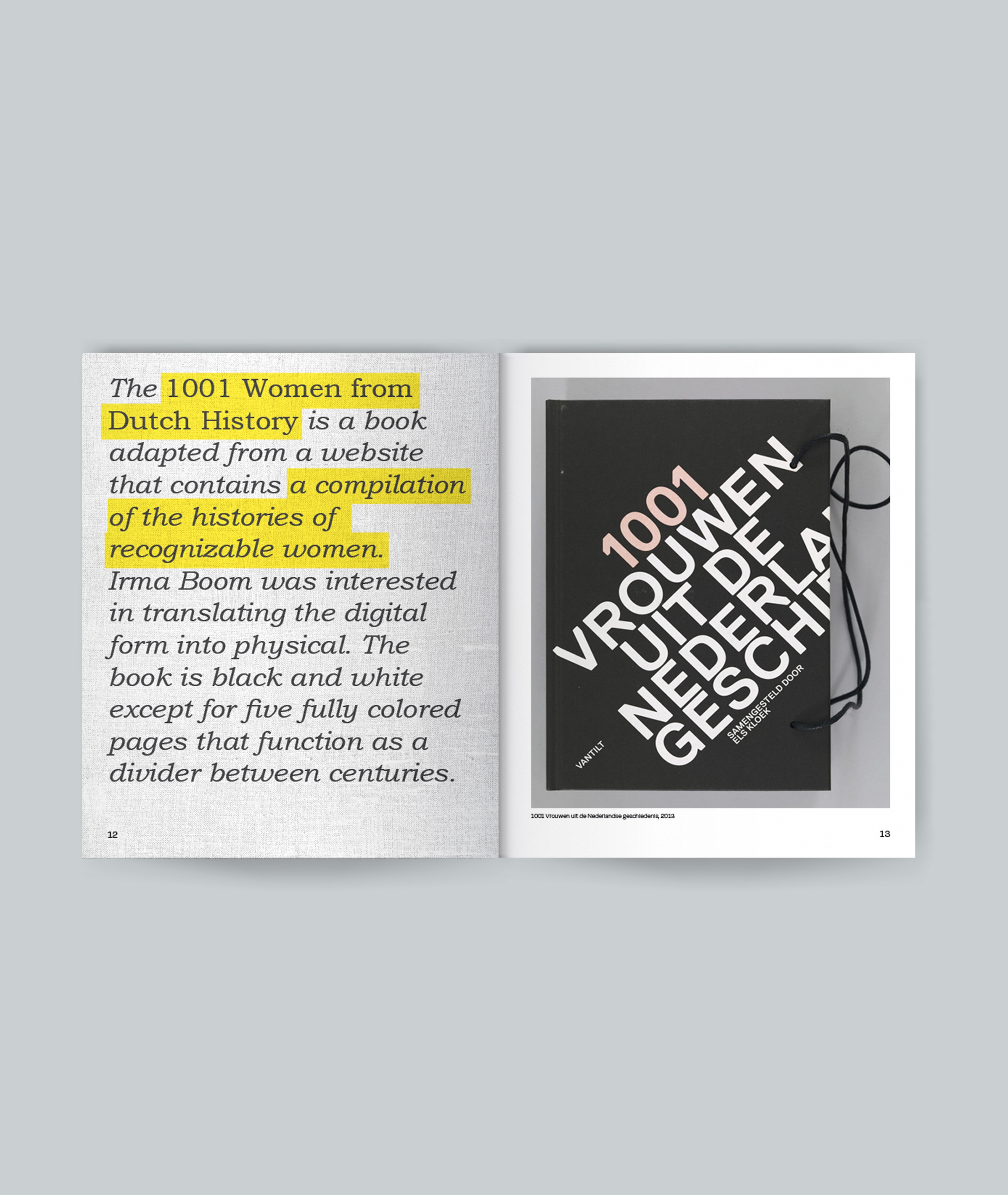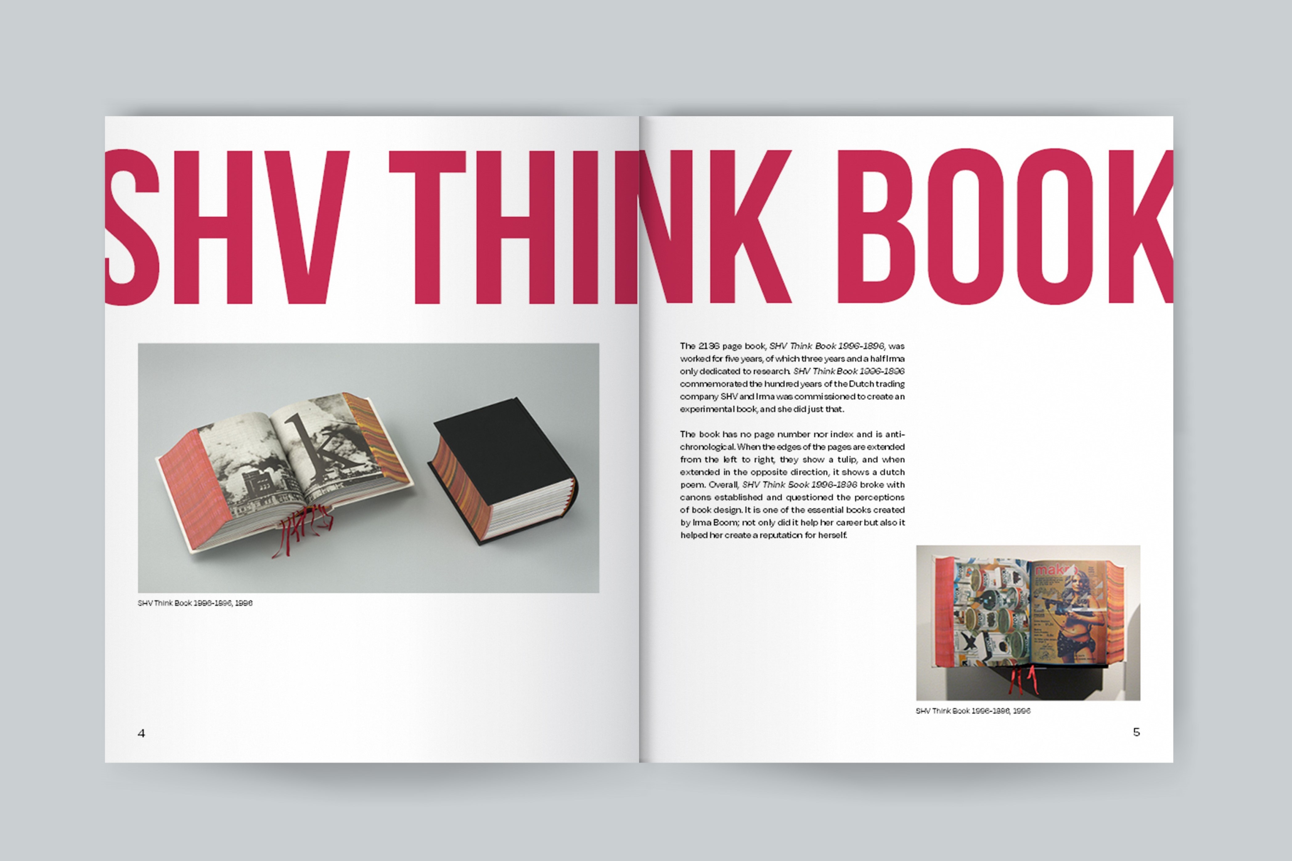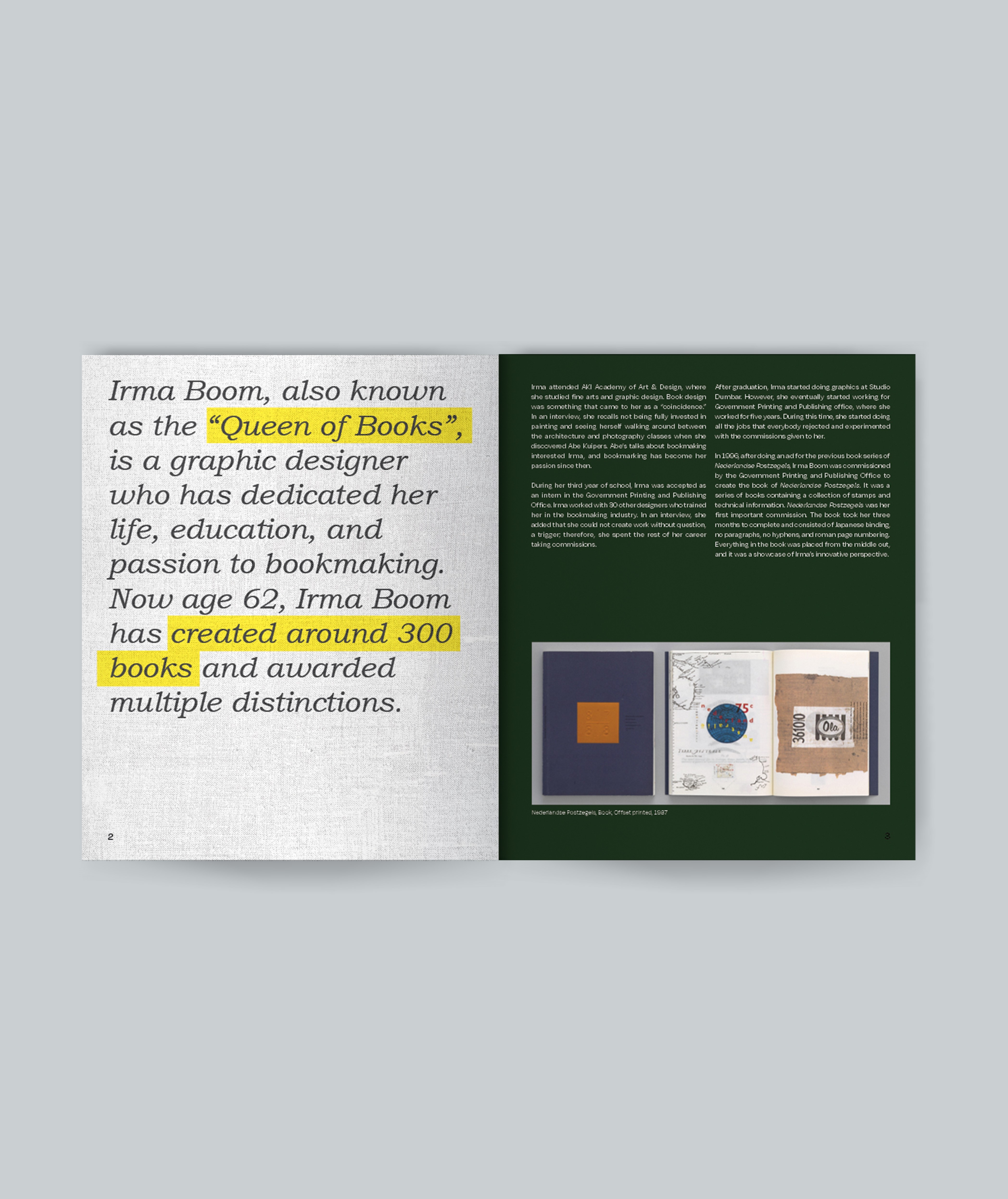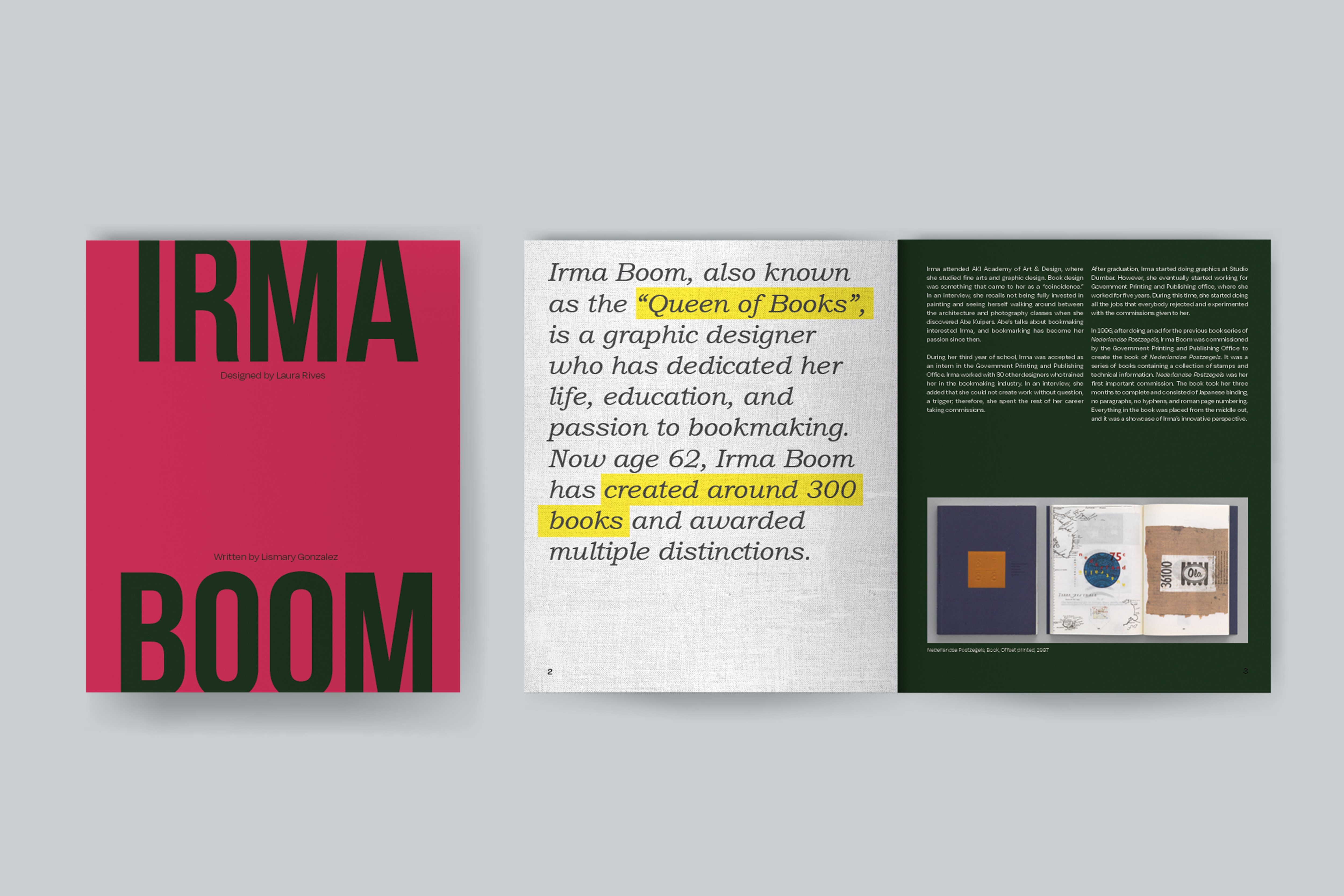 The Irma Boom Booklet is an informative and visual book designed using large typography, color —both elements she uses in many of her works.